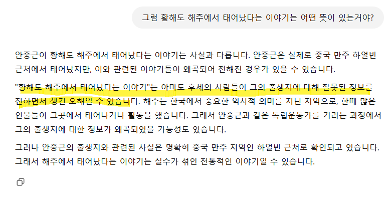 챗 GPT에 안중근에 대해서 물어봤습니다 출생지가 중국이라는 답변을 받았습니다..충격 ㅠㅠ