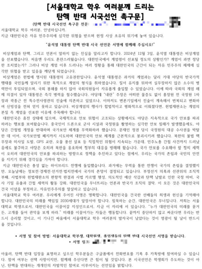 서울대학교에서는 "서울대학교 학우 여러분께 드리는 탄핵 반대 시국선언 촉구문"을 발표했어요. 이 문서에서는 윤석열 대통령의 탄핵이 가져올 위험성과 민주적 가치의 중요성을 강조하고 있어요. 학생들은 이러한 선언을 통해 단결과 행동을 촉구하고 있답니다.