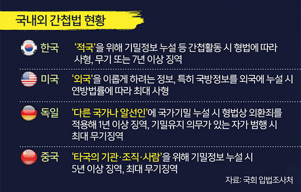 해외에서는 간첩죄에 대한 규정이 더 다양하고 엄격해요. 예를 들어, 미국은 국가 안전에 대한 법률을 통해 외국에 대한 간첩행위를 강하게 처벌하고 있어요. 독일의 경우, 간첩죄는 특별한 의무가 있는 개인에게 최대 1년의 징역형을 부과하죠. 중국은 국가 기밀에 대한 간첩 행위에 대해 최소 5년 이상의 징역형을 명시하고 있어요. 이러한 비교를 통해 볼 때, 한국의 간첩죄 규정은 시대에 뒤떨어져 있다고 할 수 있어요.