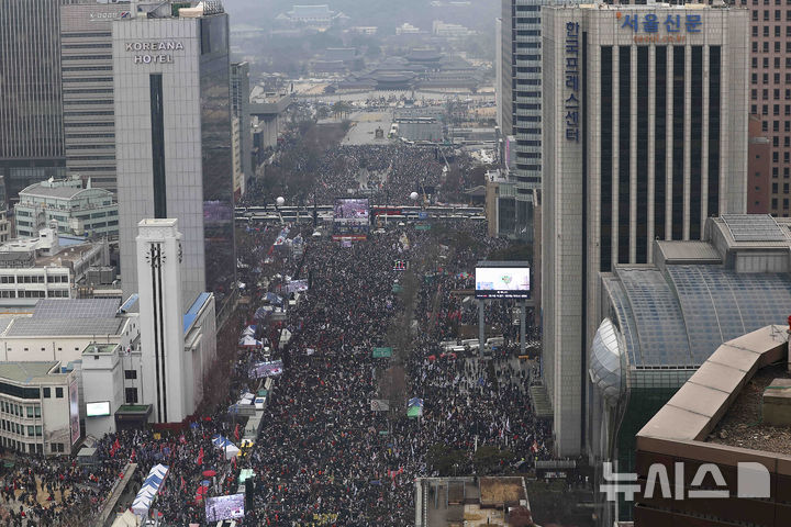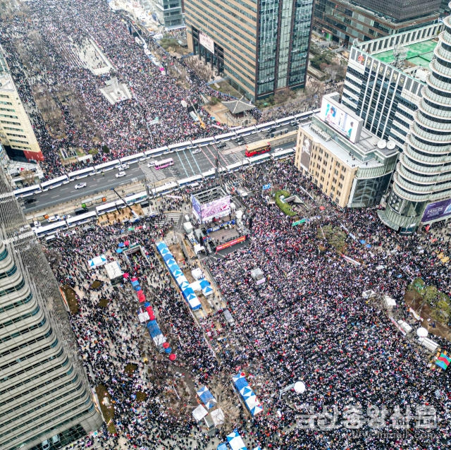 이 사진은 집회가 열린 도심의 모습으로, 많은 사람들이 모여 있는 모습이 잘 드러나 있어요. 이처럼 많은 사람들이 모인 것은 그만큼 탄핵 반대의 목소리가 크다는 것을 의미해요.