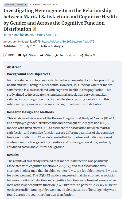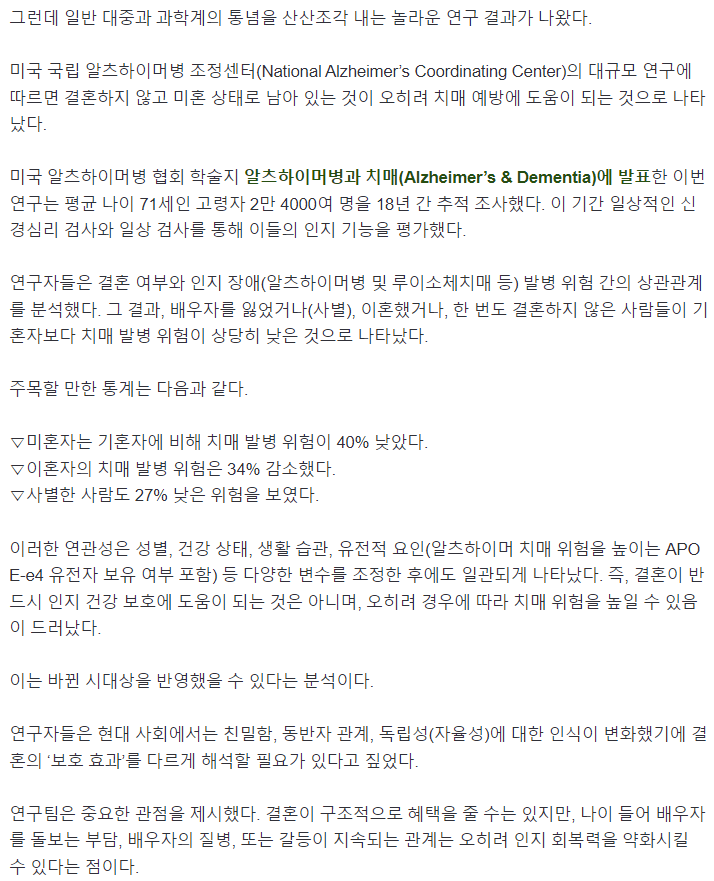 혼자 사는 것보다 결혼을 통해 사회적 관계를 유지하는 것이 인지 건강에 더 유리할 수 있다는 점이죠.