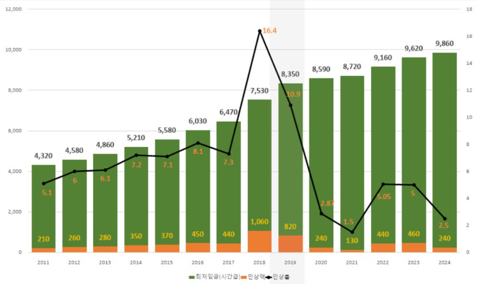 최저임금은 매년 증가하는 추세를 보이고 있어요. 2011년부터 2024년까지의 변화를 살펴보면, 매년 꾸준히 인상되고 있음을 알 수 있어요. 특히 2018년에는 16.4%의 큰 폭으로 인상되었고, 이후에도 지속적인 상승세를 이어가고 있어요.