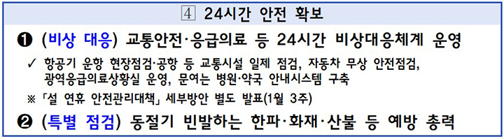 비상대응체계 운영: 설 연휴 기간 동안 교통안전과 응급의료 등에 대한 24시간 비상대응체계를 가동할 것입니다.