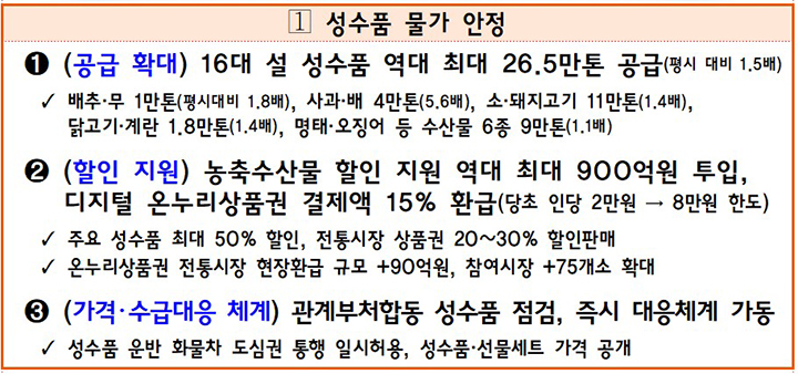 성수품 공급 확대: 설 성수품 공급량을 평소보다 1.5배 늘려 26만 5천 톤을 공급할 계획입니다.