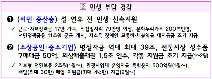 지원금 조기 지급: 여러 종류의 지원금을 오는 2월까지 빨리 지급할 계획입니다.