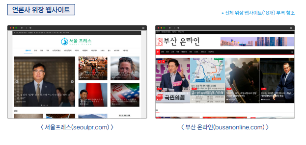 - 위장 웹사이트의 특징: 이들 웹사이트는 한국 지역 언론사와 유사한 이름과 도메인을 사용하여 신뢰성을 높이려는 시도를 하고 있다.