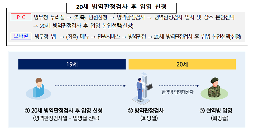 함께 선택한 후 19세(2025년)가 아닌 20세(2026년)에 병역판정검사를 받고 사전 신청한 입영월(2026년)에 입영할 수 있게 된다.
