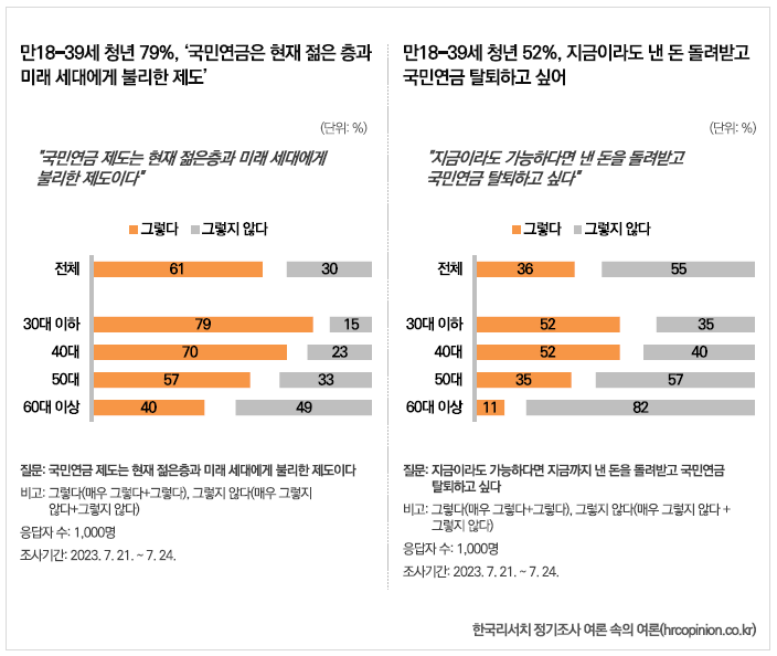 또한, 젊은 세대는 국민연금 제도가 자신들에게 불리하다고 생각하는 경향이 강해요. 18세에서 39세 사이의 응답자 중 79%가 현재의 국민연금 제도가 젊은 세대에 부정적인 영향을 미친다고 응답했답니다.