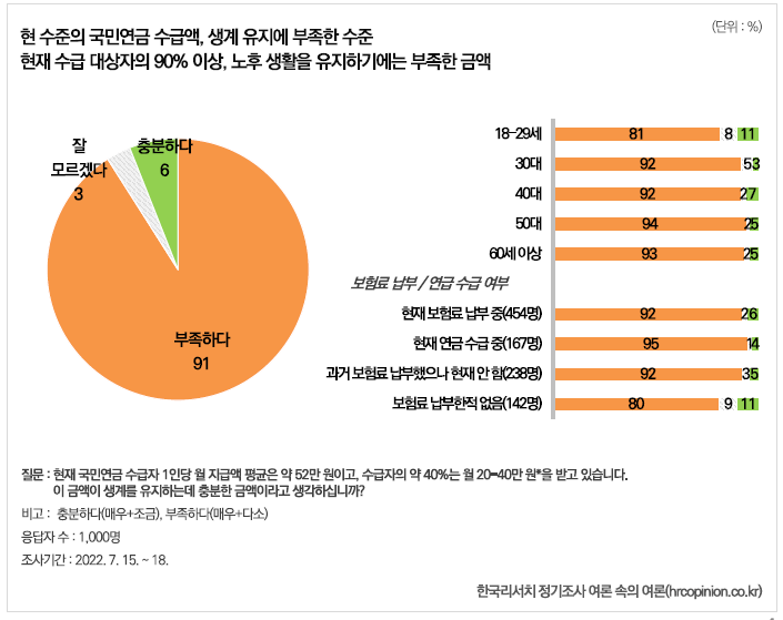 국민연금의 가장 큰 문제는 재정적자와 수급자의 불만이에요. 많은 사람들이 현재의 연금액이 노후 생활을 유지하기에 부족하다고 느끼고 있답니다. 최근 조사에 따르면, 91%의 응답자가 현재의 연금액이 불충분하다고 응답했어요.